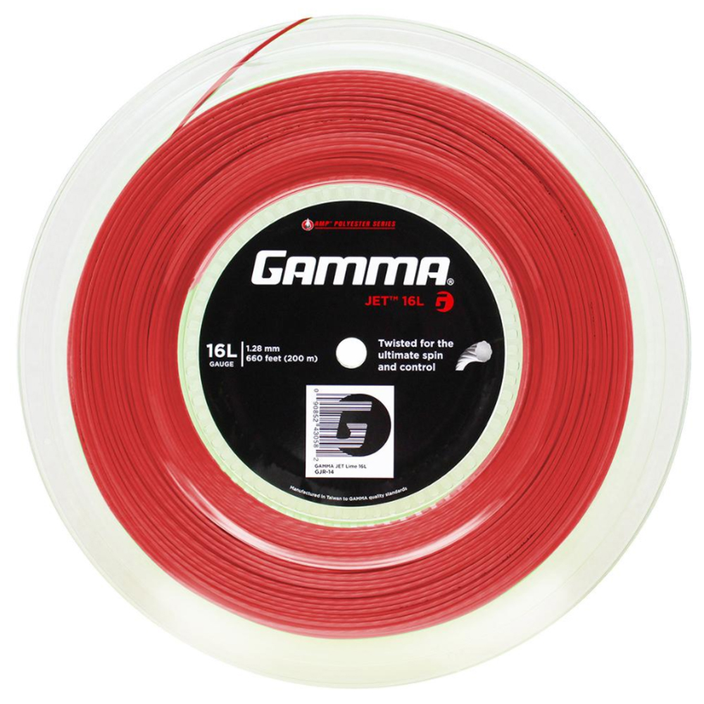 GAMMA JET is a polyester string has a twisted ribbed shaped profile and a textured surface for maximum ball bite and huge amounts of spin...